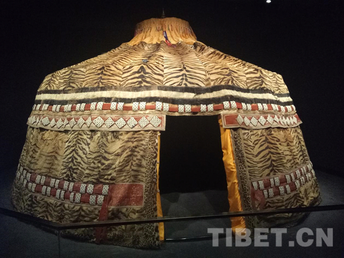 1638年,蒙古首領(lǐng)固始汗會見五世達(dá)賴?yán)?。?jù)理塘縣志及各類史料推測,此帳篷便是當(dāng)此前后,由固始汗贈與五世達(dá)賴?yán)锏??!盎⑵づ裢w使用了100多張虎皮,上部黑色的兩圈為黑熊皮,黑熊皮夾著的白色部分為駱駝皮,帳篷門框兩邊使用的則是豹皮,四周又用1萬多顆海貝鑲串成吉祥圖案。這樣一頂帳篷造價不菲,考慮到當(dāng)時海貝在當(dāng)?shù)厥强梢粤魍ǖ呢泿?,整頂帳篷光海貝就相?dāng)于2億元人民幣?!辈┪镳^講解員介紹道。