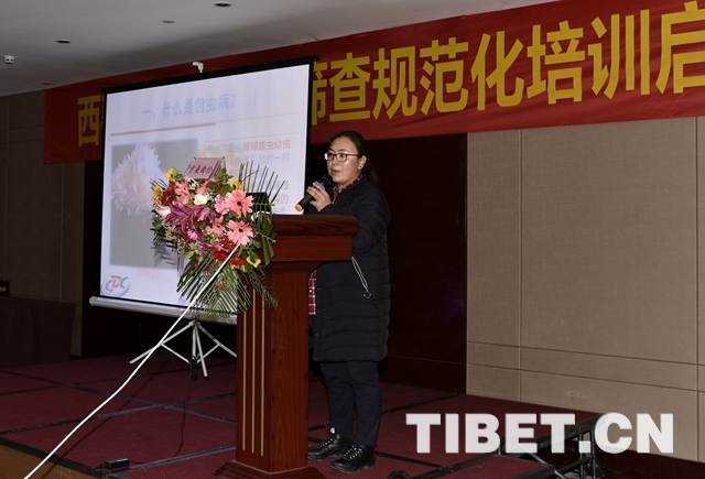 圖為12月16日召開(kāi)的包蟲(chóng)病篩查規(guī)范化培訓(xùn)會(huì)上,西藏疾控中心寄生蟲(chóng)病防治所所長(zhǎng)貢桑曲珍介紹西藏包蟲(chóng)病綜合防治工作開(kāi)展情況。