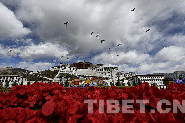 拉薩市園林局負(fù)責(zé)人介紹,3000多盆仿真花卉和4萬余束紅黃兩色的絹花用在布達(dá)拉宮廣場中心位置進(jìn)行地面裝飾,營造春節(jié)、藏歷新年的濃厚氛圍。