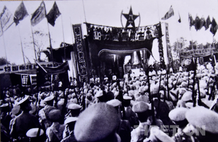 圖為十八軍在樂(lè)山舉行進(jìn)軍西藏誓師大會(huì)。翻拍:王媛媛