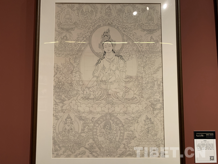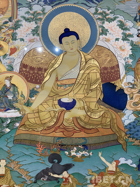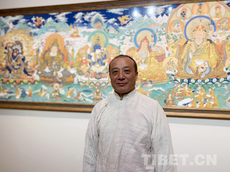 很多人對(duì)唐卡并不陌生,但對(duì)一幅唐卡是怎么被畫出來的卻是一知半解。唐卡的內(nèi)容大多來源于佛教里的經(jīng)文,里面有詳細(xì)的文字描寫,佛的穿著,顏色的搭配,甚至是佛們佩戴的首飾、拿的法器都有明確且詳細(xì)的記錄和與描寫。藝術(shù)家還需要有豐富的想象力和創(chuàng)造力,要有很強(qiáng)的構(gòu)圖能力,最重要的是要遵照《度量經(jīng)》等佛教儀軌,正規(guī)的去畫?!皠?chuàng)作一幅唐卡不容易,藝術(shù)家必須要懂佛教的文化、儀軌,懂《度量經(jīng)》,再加上藝術(shù)家自己的藝術(shù)創(chuàng)造能力,才能夠畫好一幅唐卡,這需要藝術(shù)家的綜合能力?!蹦锉纠^續(xù)說:“起稿、涂色、暈染、拉金線、拉線條等每一步驟都是在考核藝術(shù)家自身的能力,藝術(shù)家自己要不斷地學(xué)習(xí):學(xué)習(xí)佛教文化,了解文化的內(nèi)涵,藝術(shù)家需要更多地把心思投入到唐卡,并提高自身的藝術(shù)造詣才能夠畫好一幅唐卡。”