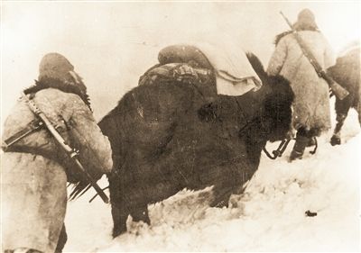 圖為先遣連官兵們拽著牦牛的尾巴上雪山。圖片來源:解放軍報