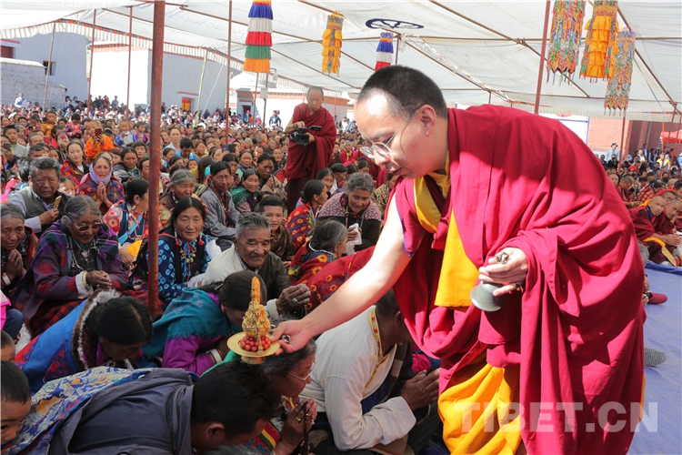 禮佛后,十一世班禪登上加查拉康正門前臨時寶座,接受托林寺僧人敬獻曼扎、切瑪?shù)龋S后,在寺廟高僧引領(lǐng)下,為長壽灌頂貢品加持,帶領(lǐng)眾僧共同誦經(jīng),祈愿莊嚴(yán)國土、國泰民安、普渡眾生,為1000余名僧俗信教群眾進行長壽灌頂。