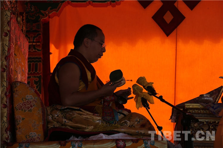 儀表莊重的十一世班禪以洪亮的聲音念誦灌頂經(jīng)文,教導(dǎo)僧俗信教群眾清凈自身,利樂眾生。緊接著,十一世班禪嫻熟地運用各種法器開示密咒,在場僧眾雙手合十,凝神靜聽。