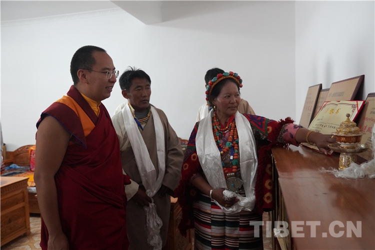 參觀朝拜活動結(jié)束后,十一世班禪還前往古格王朝遺址腳下的札布讓村走訪看望農(nóng)戶金珠德吉并送去了慰問金。金珠德吉一家在家門口迎接十一世班禪并敬獻哈達,隨后迎請十一世班禪到客廳。十一世班禪與金珠德吉一家親切交談,詳細(xì)了解家庭生產(chǎn)生活情況。