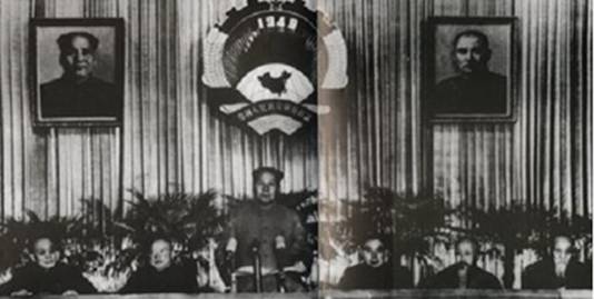 1954年12月21日,全國政協(xié)二屆一次會議在京舉行。會議修改了政協(xié)章程。圖為大會主席臺。左起:郭沫若、李濟(jì)深、毛澤東、周恩來、沈鈞儒、陳叔通 圖片來源:人民網(wǎng)