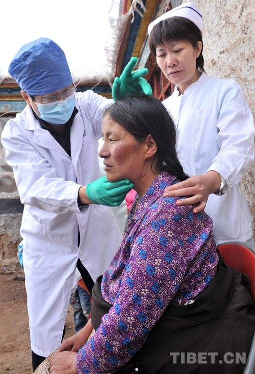 曾為斯求卓瑪進行手術(shù)的北京口腔醫(yī)院頭頸腫瘤科主任韓正學(左)上門來到班戈縣新吉鄉(xiāng),為斯求卓瑪做術(shù)后檢查(唐召明2015年7月14日攝)