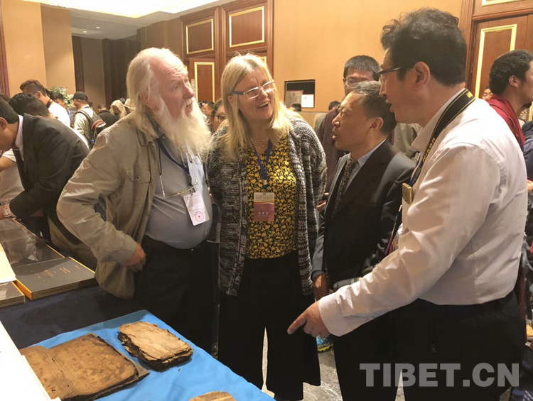圖為洛賽向外國(guó)學(xué)者介紹古藏文經(jīng)卷 圖片由洛賽提供