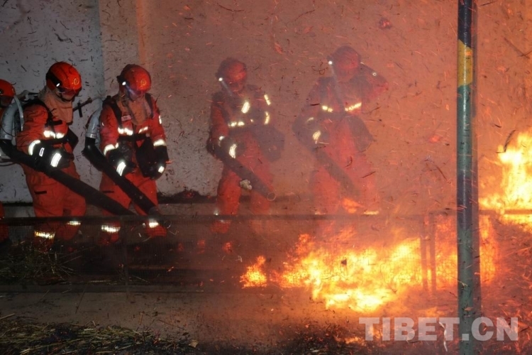 中國西藏網(wǎng)訊 12月17日晚,西藏自治區(qū)昌都市森林消防支隊左貢中隊展開了一場夜間實戰(zhàn)訓(xùn)練,場面火熱。圖為實戰(zhàn)訓(xùn)練中消防員們互相配合,撲打火線。
