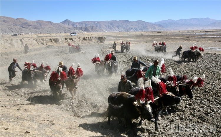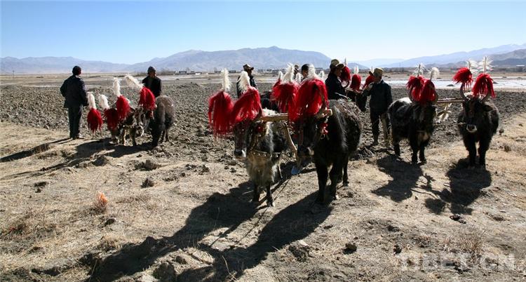 圖為日喀則的開(kāi)耕節(jié),農(nóng)民們?cè)谶M(jìn)行二牛抬杠犁地比賽