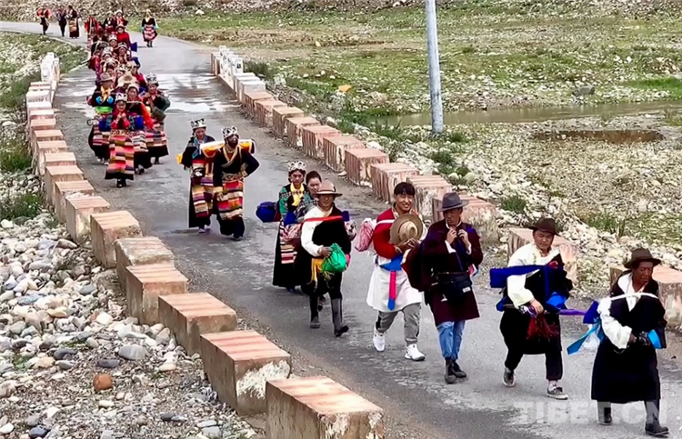 圖為墨竹工卡的人們?cè)谔镩g繞行,舉行“望果節(jié)”游行儀式慶祝豐收
