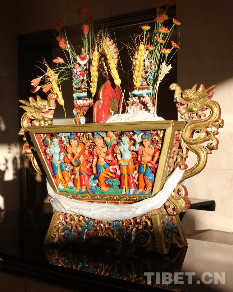 藏歷1月1日,是藏族人民一年一度最重要的節(jié)日。在拉薩,從藏歷12月初開(kāi)始,我的鄰居們就開(kāi)始打掃衛(wèi)生、準(zhǔn)備年貨了,其中,木雕彩繪的精致方斗“切瑪”和一些面粉制作的點(diǎn)心是每家必備的供品?!扒鞋敗眱?nèi)裝滿酥油拌好的糌粑、炒熟的青稞和人參果等食品,上面插上青稞穗、雞冠花,有的還要撒上酥油做的彩花板。同時(shí),供品的旁邊還要擺放一個(gè)彩色酥油花塑的羊頭,到了初一那天,再將提前浸泡長(zhǎng)出兩寸青苗的青稞種子擺于佛龕茶幾之上。這些擺設(shè)表達(dá)著對(duì)新的一年風(fēng)調(diào)雨順、農(nóng)牧業(yè)獲得豐收祈愿。