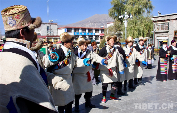 圖為藏歷新年期間,拉薩郊區(qū)的民眾邀約至大昭寺廣場(chǎng)歡歌悅舞。