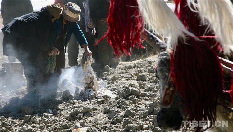 婦女們和沒(méi)有參賽的男人們?cè)谔镞叾焉习刂?、灑上青稞面、澆上青稞酒,然后點(diǎn)燃,進(jìn)行煨桑祈福。