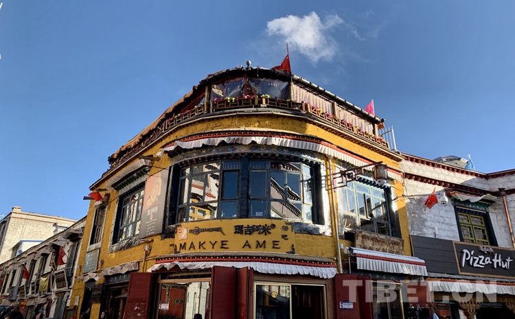 仔細(xì)觀察就會(huì)發(fā)現(xiàn),八廓街的建筑群里很少有大窗戶的房子,偶爾出現(xiàn)一兩棟,那必是有身份的大戶人家了。在舊時(shí),普通百姓家的房子都被統(tǒng)一成四方型的屋體,小小的窗戶,白色外墻,不允許有其他形狀、顏色或是出奇的設(shè)計(jì)。而就在八廓街的東南角有一棟暗黃色圓角的兩層小樓異常醒目,這當(dāng)然不會(huì)是一座普通的房子了,據(jù)說(shuō)這里曾是六世達(dá)賴?yán)飩}(cāng)央嘉措常常秘密造訪的地方。他曾在此地寫(xiě)下了著名的情詩(shī)《在那東方的山頂上》,“在那東方高高的山頂上,升起一輪皎潔的月亮,未嫁嬌娘的面容,時(shí)時(shí)浮現(xiàn)在我的眼前”?!拔醇迡赡铩钡牟卣Z(yǔ)是“瑪吉阿米”,現(xiàn)在這里是一家叫做“瑪吉阿米”的藏餐吧。