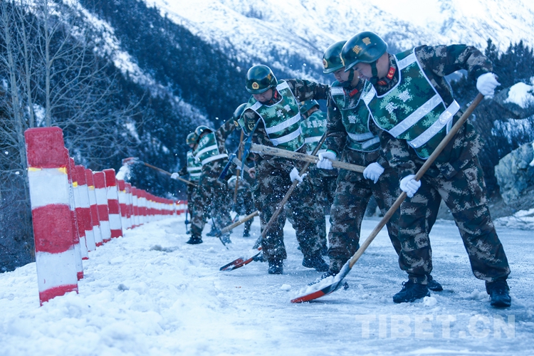 圖為官兵在川藏線然烏湖段清理路面積雪結冰