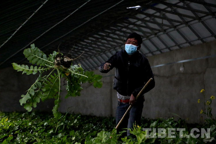 圖為瓊結(jié)縣相達村村民正在溫室大棚里采摘蘿卜 攝影:倫珠澤仁
