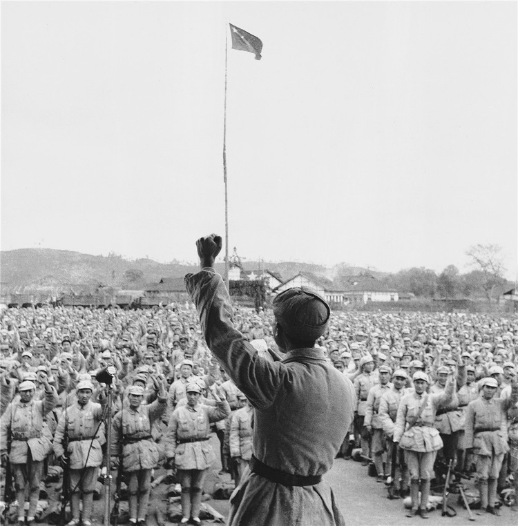 中國西藏網(wǎng)訊 70年前的今天,1950年3月7日,在四川樂山舉行的進軍西藏誓師大會上,中國人民解放軍第十八軍的將士們熱血沸騰、士氣高揚,時任十八軍軍長的張國華在會上宣讀誓詞,立下“誓把五星紅旗和八一軍旗插到喜馬拉雅山上”的錚錚誓言。一位年輕的隨軍記者藍志貴跑到主席臺上,舉起相機拍下這一重要歷史時刻。