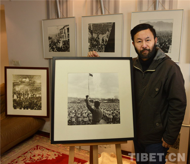 圖為黃建鵬在藍志貴拍攝的《第十八軍在樂山舉行進軍西藏誓師大會》作品旁,身后其它西藏作品也均為藍志貴作品