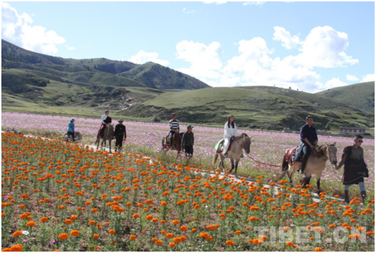 從理塘縣前往稻城亞丁機場方向60多公里,翻過一座小山坡,一片如夢似幻的花海景觀瞬間映入眼簾。曾經(jīng)名不見經(jīng)傳的小山村——濯桑鄉(xiāng)漢戈村已實現(xiàn)“沙化地”到“花?!钡耐懽?,成為新的網(wǎng)紅打卡點。在花團(tuán)錦簇間拍照、在草原上騎馬,或者到旁邊康藏陽光種植基地采摘“極地果蔬”、購買農(nóng)民合作社的原生態(tài)農(nóng)副產(chǎn)品……游客可盡興體驗。