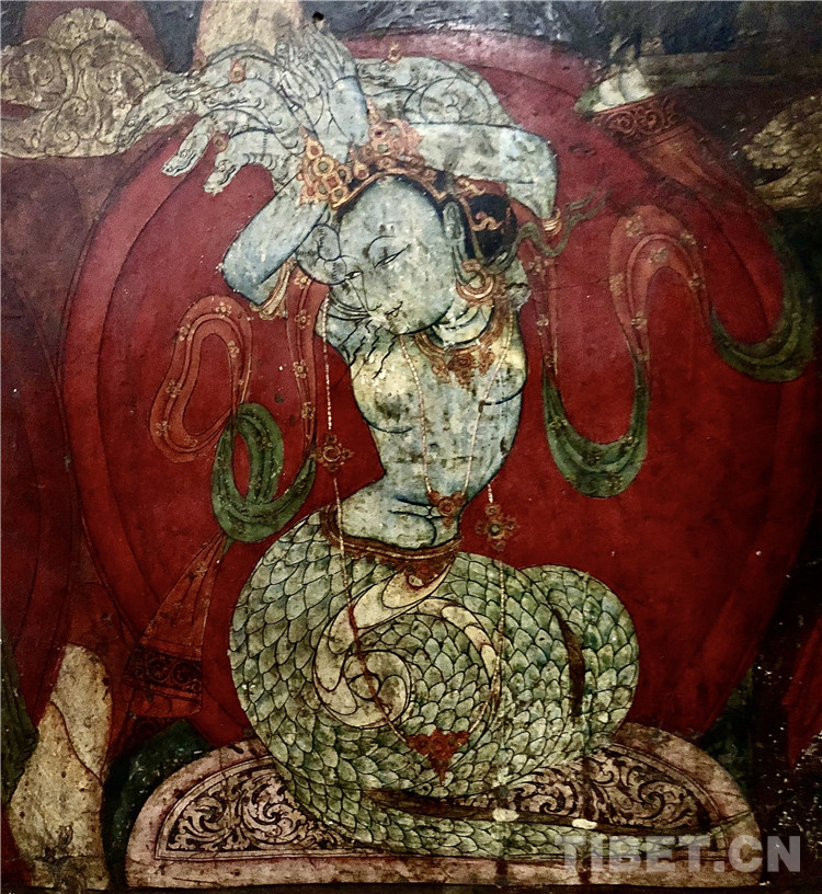 追溯其源頭,在阿里的巖畫中曾經(jīng)有不少龍神崇拜的母題,苯教經(jīng)典《十萬龍經(jīng)》亦有記載龍母創(chuàng)生萬物的神話。所以,有學(xué)者將這類人獸結(jié)合的龍女形象,看作是苯教母題下古格造像藝術(shù)的產(chǎn)物。