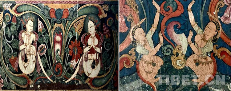 托林寺以龍女為代表的女性形象,留給我極深的印象,她們一方面?zhèn)鬟_(dá)的是宗教的光明和神圣,表現(xiàn)形式卻又是世俗的抒情性和誘惑性并存。端莊的面龐,優(yōu)雅的微笑,半裸的豐滿身軀扭轉(zhuǎn)出性感的曲線,置身于繪滿的花草圖案中,極盡優(yōu)美。當(dāng)我走進(jìn)這些畫作中,看著看著就迷失了,常常不知她們是人還是神,那空間是人間還是天國(guó)。(中國(guó)西藏網(wǎng) 文、圖/陳丹)