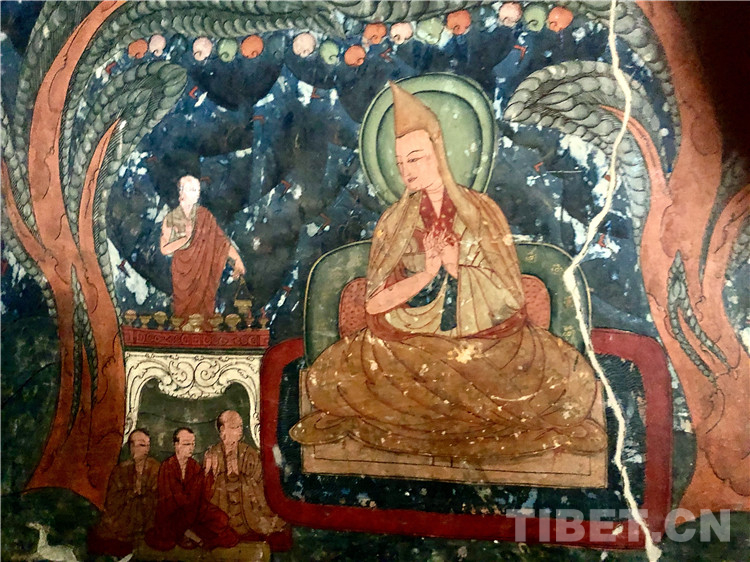 自從朗達(dá)瑪滅佛以來,佛教在吐蕃遭到了致命的打擊,一些僧人避難至遙遠(yuǎn)的阿里,保存了佛教的火種,并且開啟了藏傳佛教的后弘期。托林寺雖遠(yuǎn)在西藏邊緣一隅,卻在藏傳佛教后弘期扮演了重要的角色。11世紀(jì),受阿里地區(qū)的統(tǒng)治者絳曲沃和大譯師仁欽桑布之請(qǐng),阿底峽由納措催成杰瓦、俄列貝希繞、甲尊僧格等五人到印度迎請(qǐng)來到托林寺,駐寺三年,幫助校譯佛經(jīng)。后又至衛(wèi)藏、拉薩等地譯經(jīng),成為西藏復(fù)興佛教的一位重要人物。關(guān)于這一段歷史的表述,托林寺壁畫中有這樣一幅小圖。圖右邊戴帽者為主佛阿底峽尊者,阿底峽為古印度僧人、佛學(xué)家,聲名極盛。左上角站立者是拉喇嘛絳曲沃,左下三人分別為:譯師納措催成杰瓦、俄列貝希繞、甲尊僧格。