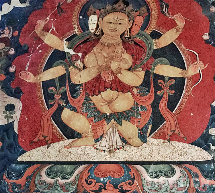 葉衣佛母的識(shí)別標(biāo)志是其身著以樹葉編織的衣裙,左上手持藥枝,其他五臂則持不同法器。葉衣佛母在藏傳佛教中是主管疾病醫(yī)藥的神。三頭六臂九眼,上身坦露,身軀呈現(xiàn)半蹲立姿態(tài),本件作品之風(fēng)格可以見到15世紀(jì)上半葉江孜風(fēng)格在古格繪畫的運(yùn)用:包含以紅色,綠色,藍(lán)色為主的色調(diào);源于尼泊爾的淚滴狀頭冠形式;肩上飄逸的衣帶與衣著上的織繡圖案等。同時(shí),背景中以暈染的深淺來呈現(xiàn)凌厲的巖石,以及呈卷狀拖曳的祥云圖飾,則是使用了漢地美學(xué)的元素。