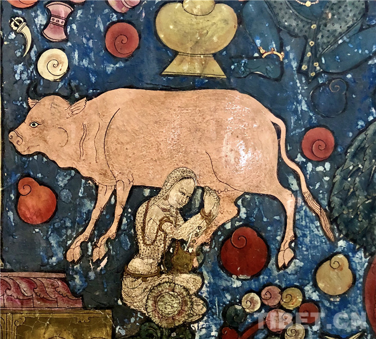 對(duì)于世俗生活的紀(jì)實(shí)性記錄,是古格時(shí)期壁畫的一大貢獻(xiàn)。生活場(chǎng)景、器物大量出現(xiàn)在托林寺壁畫中,圖中擠奶女子的神情很專注,牛也安靜得好似在享受。乳汁從女子兩肘之間流入她身前的罐子里。人和動(dòng)物的比例都很精準(zhǔn),在大面積深色的背景上,畫家選用了淺色來描繪這個(gè)畫面,使得這微小的細(xì)節(jié)非常醒目。牧業(yè)一直是阿里地區(qū)的主要產(chǎn)業(yè),擠奶、制作奶制品是當(dāng)?shù)孛课徊刈鍕D女都會(huì)的家務(wù)。在自由創(chuàng)作的區(qū)域,壁畫創(chuàng)作者很自然地將這日常勞作描繪出來。但是,女子的服飾是印度風(fēng)格,牛也不是青藏高原特有的牦牛,說明了當(dāng)時(shí)古格藝術(shù)對(duì)外域文化的開放性。