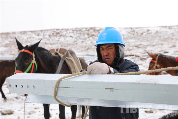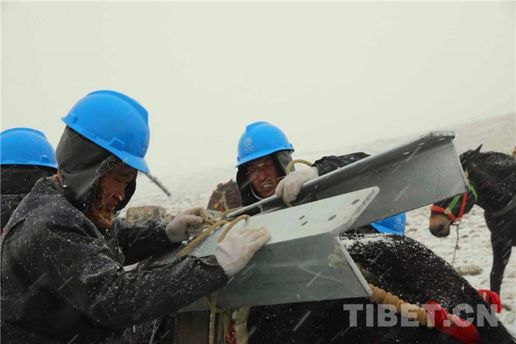 加上山脊上都是尖石頭,馬蹄子上粘了雪,走路也開始變滑。眼看著不遠(yuǎn)的運(yùn)輸距離,其他塔位半個小時能運(yùn)輸一趟,在風(fēng)雪里,又在5357米海拔高的地方,變成了一個半小時一趟。此時4R053號塔位氣溫已經(jīng)降到零下25度,風(fēng)速已經(jīng)達(dá)到8級,人在風(fēng)雪里已經(jīng)站不住了,更不要說是負(fù)重的馬匹?!靶值軅円а缊?jiān)持住,這一趟運(yùn)輸必須完成,呆久了馬兒要受不了了,馱完這一趟,我們就往山下撤?!鄙辰鹑A在風(fēng)雪里大聲地吼道。