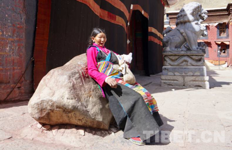 圖為一位婦人靠在薩迦寺的靈石上祈禱治愈她腰部的疾病
