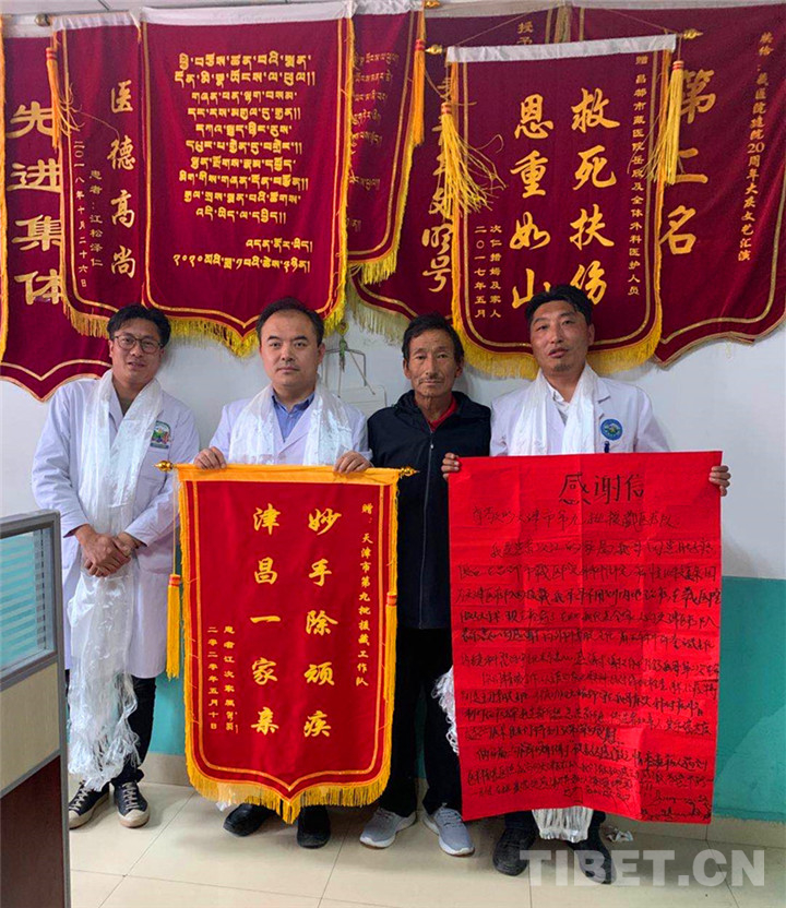 圖為患者(右二)向第九批援藏醫(yī)療工作隊(duì)贈(zèng)送錦旗和感謝信
