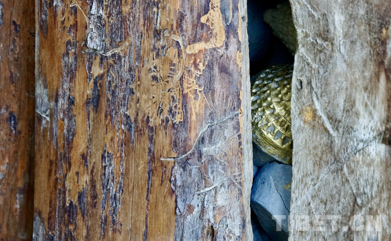 上百年的羊皮經(jīng)筒,里面裝著厚厚的一匝匝經(jīng)卷,被若干次轉(zhuǎn)動后,羊皮裂開了口子,巧手的藏族群眾用皮繩將歲月的裂口密密縫住,經(jīng)筒又可以轉(zhuǎn)繞好多年。擦康被木板封住了,小蟲在木板上啃蝕出畫作一樣的痕跡,木板縫隙中,閃耀著金色的光芒,光芒來自擦康里放置的擦塔——一個上面有著108座小塔的擦塔。