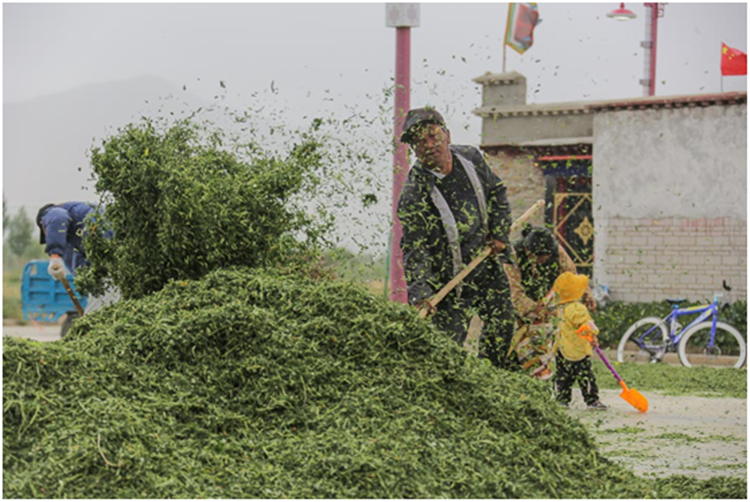 圖為扎囊縣扎其鄉(xiāng)德吉新村村民晾曬苜蓿草 攝影:趙耀