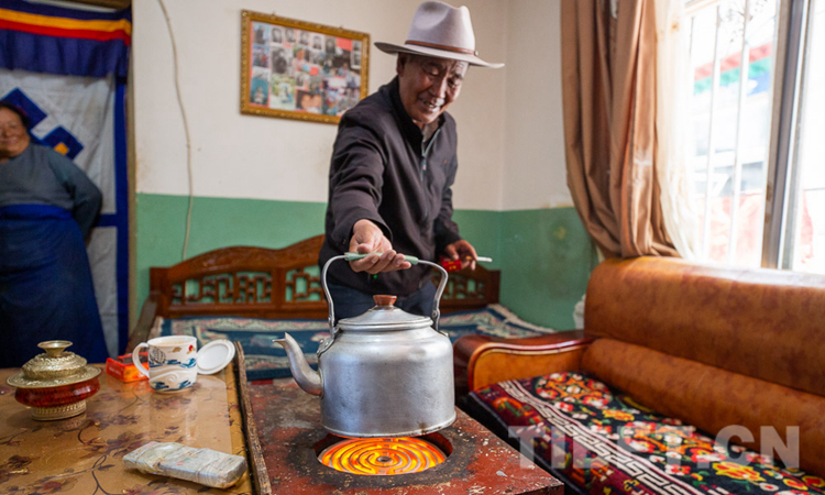 圖為旺堆正在將水壺放在電爐子上 攝影:趙耀