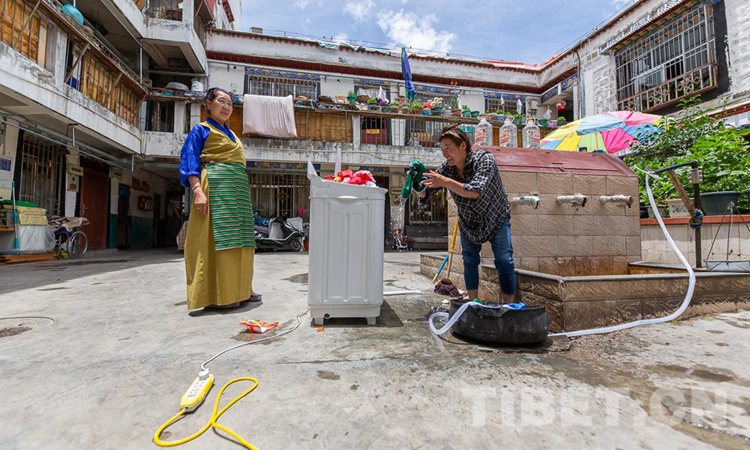 圖為大院內(nèi)旺堆的鄰居正在用洗衣服 攝影:趙耀