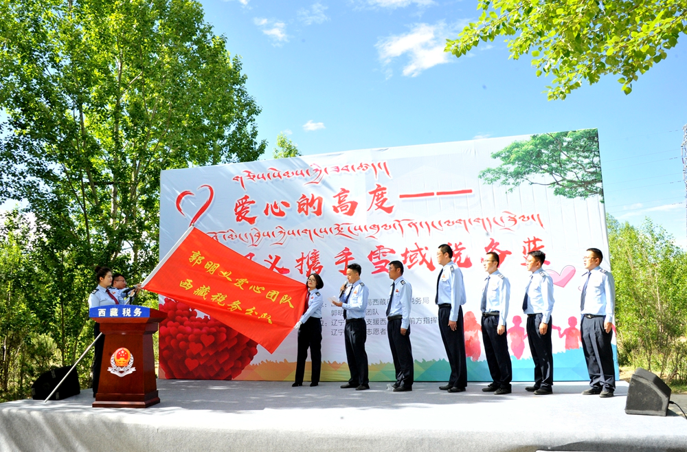 接過“郭明義愛心團隊西藏稅務分隊”的大旗,一組青年稅務干部登臺宣誓。稅務干部次仁頓珠說,加入郭明義愛心團隊既光榮,又是一份沉甸甸的責任,要將這份愛心傳承好、發(fā)揚好,用心、用情投入公益事業(yè),在決戰(zhàn)脫貧攻堅、決勝全面小康的舞臺上展示稅務藍、貢獻稅務力量。