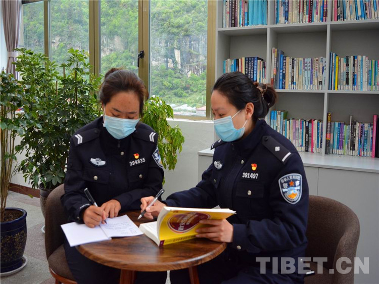 圖為“新警”索曲珍(左一)正在學習《治安管理處罰法》