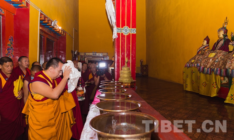 在乳巴寺,十一世班禪先后朝拜了甘珠爾拉康、文物珍寶殿、護(hù)法神殿等,隨后在杜康殿為僧眾摸頂傳授《兜率天上師瑜伽修法》。(中國西藏網(wǎng) 記者/王淑 趙耀 鄭朔)