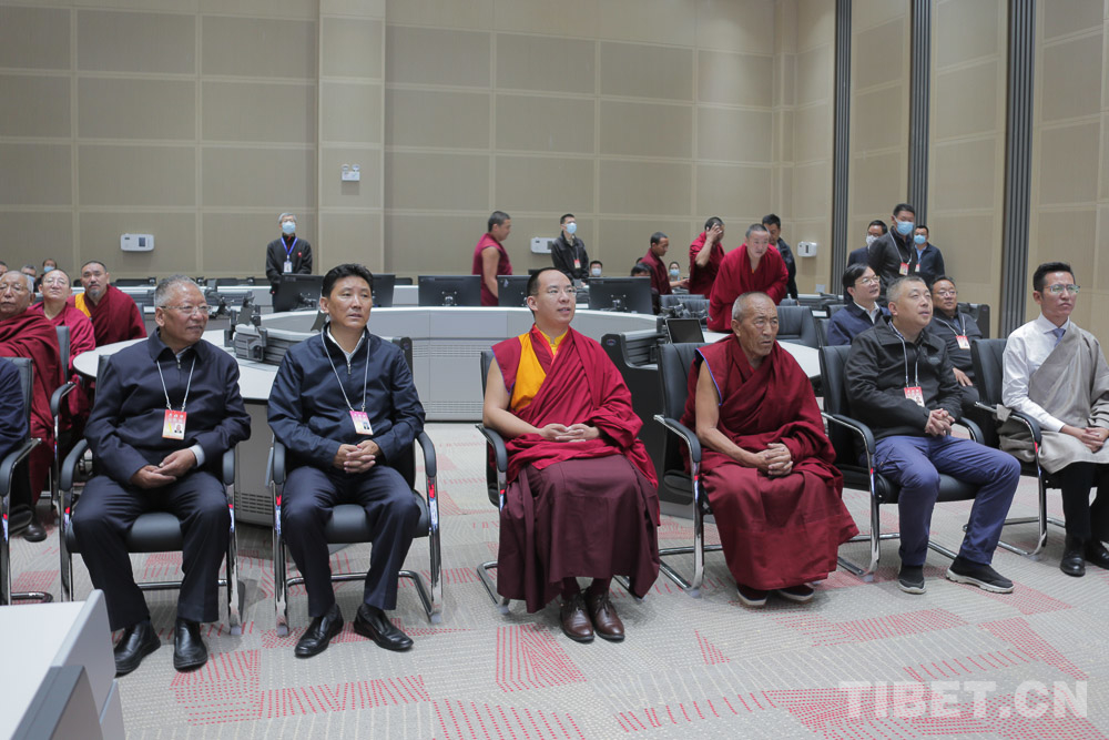 圖為十一世班禪在控制中心內(nèi)觀看宣傳片 攝影:王淑