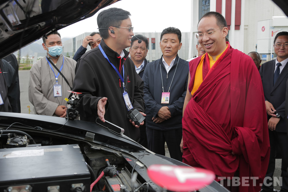 圖為十一世班禪觀摩無人駕駛汽車內(nèi)部構(gòu)造 攝影:王淑