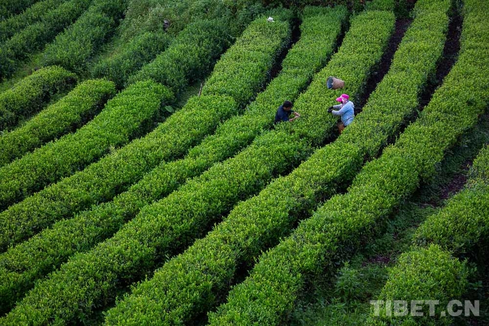 清晨的云霧還未散去,十一世班禪站在平臺之上俯瞰整片茶園,三三兩兩的茶農(nóng)正在采摘新茶。十一世班禪駐足良久,聽著茶場負責(zé)人介紹茶樹的生長狀況等。隨后,十一世班禪走進加工車間,仔細觀看了生產(chǎn)過程,詢問在此工作的當(dāng)?shù)匕傩沼卸嗌?、通過種茶摘掉貧困帽子的有多少等情況。