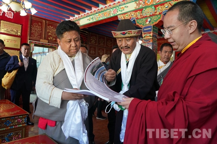 圖為十一世班禪在翻看巴吉村規(guī)劃書(shū) 攝影:王淑