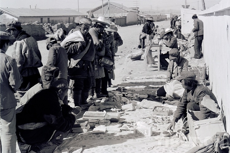 這是在青藏公路進(jìn)藏第一站的安多縣城,內(nèi)地“候鳥(niǎo)”型新客人擺地?cái)偸圪u小商品(唐召明1987年攝)