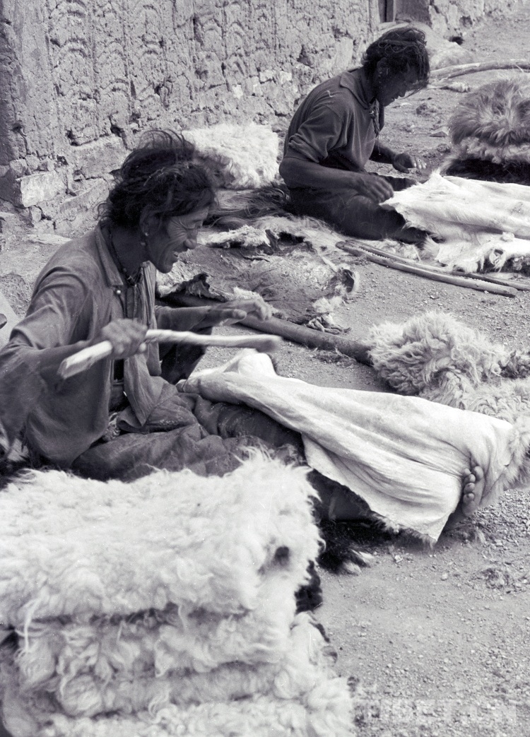 這是西藏南木林縣的藏族農(nóng)民“候鳥(niǎo)”型打工族,在雙湖特別區(qū)(現(xiàn)改為雙湖縣)嘎措鄉(xiāng)為牧民人家揉皮子(唐召明2001年攝)
