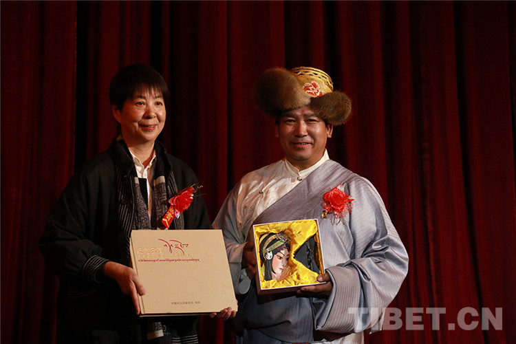 圖為紀(jì)念西藏自治區(qū)藏劇團(tuán)成立60周年會(huì)議現(xiàn)場,國家京劇院與西藏自治區(qū)藏劇團(tuán)互贈(zèng)紀(jì)念品 攝影:西藏自治區(qū)藏劇團(tuán)楊子