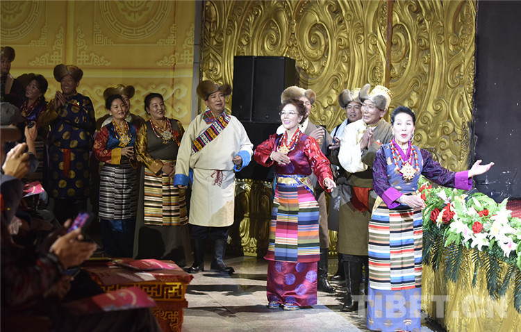 圖為紀(jì)念西藏自治區(qū)藏劇團(tuán)成立60周年藏戲?qū)鲆魳窌?huì)上大央金(右一)等藝術(shù)家登臺(tái)亮相,接受青年演員的致敬 攝影:王媛媛