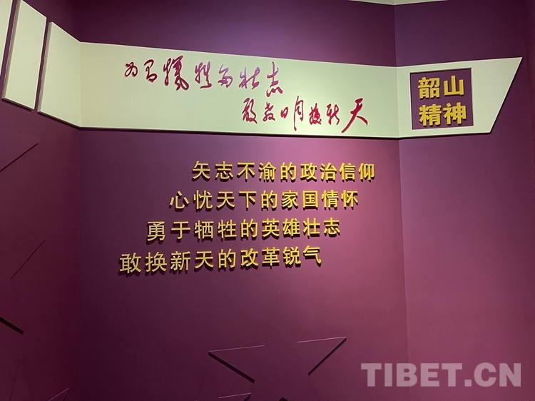 1959年6月25日,毛澤東回到韶山,在松山一號樓寫下《七律·到韶山》,將韶山精神概括為“為有犧牲多壯志 敢教日月?lián)Q新天”。圖為陳列館內(nèi)對韶山精神的標語總結。