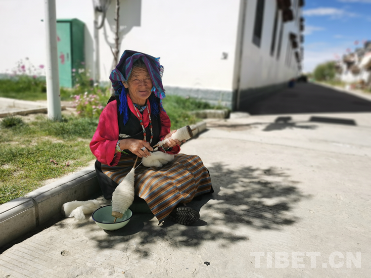 坐在自家門前樹下的尼瑪老奶奶,一邊黏線,見著我們高興地說?!白园徇w到這兒,住房生活環(huán)境太好了,去哪兒哪兒都方便,孩子們在自家門口就找到了工作,和以前相比生活好得太多了?!?/p>