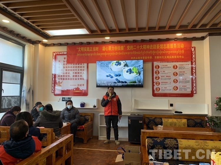 圖為山南市委宣傳部、山南市文明辦在文明實(shí)踐示范點(diǎn)開(kāi)展黨的二十大精神進(jìn)甜茶館志愿服務(wù)活動(dòng)